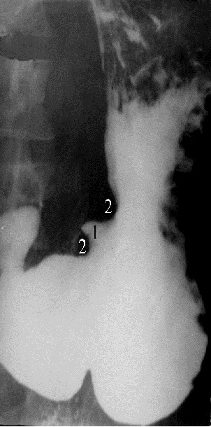 Ограниченное увеличение тени, обусловленное язвой, называется «ниша». Если ниша выходит на контур органа (рис. 13), то она имеет вид выступа треугольной или неправильной формы (1). Выше и ниже ниши часто определяется вогнутое вдавление – симптом „язвенного вала” (2). Морфологически в основе его - спазм стенки около язвы, отек слизистой оболочки и рубцовые изменения. За счет наличия язвенного вала создается впечатление большей глубины ниши. Если ниша не выходит на контур, то она определяется в виде контрастного пятна на слизистой оболочке – «ниша на рельефе» (рис. 14). Язвенный вал в подобных случаях представлен кольцевидным дефектом рельефа вокруг бариевого пятна. Язвы чаще определяются в желудке и луковице 12-перстной кишки.