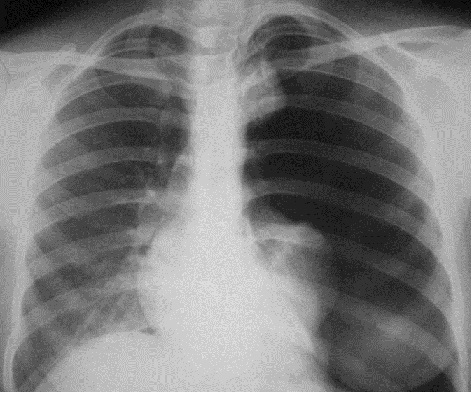 Рис. 2. Рентгенограмма органов грудной полости в прямой проекции. Слева на всем протяжении легочного поля – просветление.