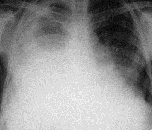 Рис. 6. Рентгенограмма органов грудной полости в прямой проекции. Более 2/3 правого легочного поля затемнено. Субтотальное затемнение. Морфологический субстрат – гидроторакс.