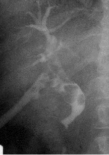 Рис. 18. Послеоперационная холангиограмма. В расширенных общем печеночном и общем желчных протоках определяется множество центральных дефектов наполнения округлой формы – конкременты.