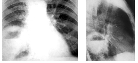 Морфологическим субстратом затемнения в легких могут быть следующие патологические процессы: 1) уплотнение легочной ткани и уменьшение (до полного отсутствия) воздушности при различных патологических процессах (воспаление, аномалии развития, цирроз, опухоли); 2) удаление легкого или ее части; 3) патологическое содержимое в плевральной полости: гидроторакс, спайки, диафрагмальная грыжа.