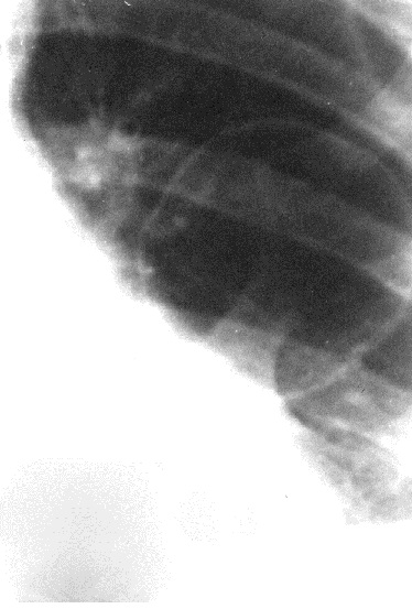 Рис. 19. Прицельная рентгенограмма нижней половины грудного отдела пищевода и желудка в горизонтальном положении пациента лежа на животе. Брюшной отдел пищевода и кардиальный отдел желудка размещены в грудной полости. Грыжа пищеводного отверстия диафрагмы.