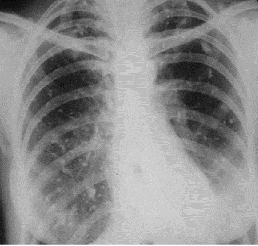 Рис. 7. Рентгенограмма органов грудной полости в прямой проекции. На всем протяжении обоих легких видны большой интенсивности очаги (обызвествления).
