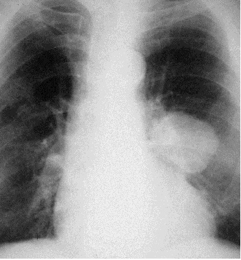 Рис. 3. Рентгенограмма органов грудной полости в прямой проекции. Слева в среднем легочном поле большое затемнение округлой формы.