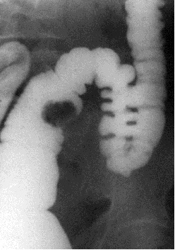 Нередко при исследовании пищеварительного канала можно выявить ограниченное уменьшение тени органа. Этот симптом называется также «дефект наполнения». В основе его чаще лежит опухолевый узел (рис 16, рис. 17), конкремент (рис. 18), который, заполняя часть полости органа, не дают проникать туда контрастной массе. Кроме этого, этот симптом может быть обусловлен наличием инородного тела неметаллической плотности. Дефект наполнения по локализации по отношению к просвету органа разделяется на 1) центральный; 2) краевой; 3) циркулярный.