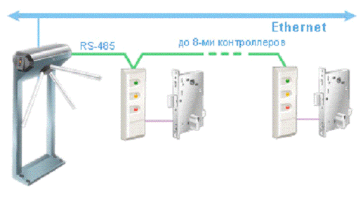 стойку турникета контроллеру можно подключить до 8-ми контроллеров