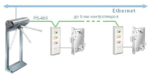 к встроенному в стойку турникета контроллеру можно подключить до 8-ми