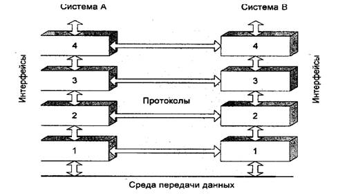 Информационное взаимодействие двух или более систем, таким образом, представляет собой совокупность информационных взаимодействий уровневых подсистем, причем каждый слой локальной информационной системы взаимодействует только с соответствующим слоем удаленной системы.