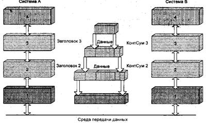 Предположим, что система А хочет отправить в систему В какой-либо текст, называемый "данные" или "информация". Этот текст передается из прикладной программы системы А в верхний уровень этой системы. Прикладной уровень системы А должен передать определенную информацию в прикладной уровень системы В, поэтому он помещает управляющую информацию своего уровня в виде заголовка перед фактическим текстом, который должен быть передан. Построенный таким образом информационный блок передается в уровень 3 системы А, который может предварить его своей собственной управляющей информацией, и т.д.
