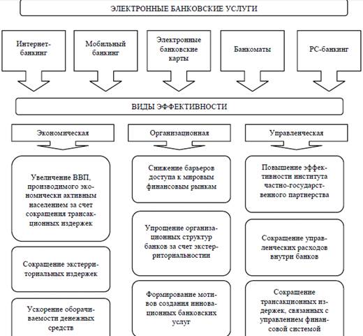 В приведенном рис. 1.1 предпринята попытка систематизации основных направлений воздействия электронных банковских услуг, в разрезе их классификации, на экономическую, организационную и управленческую эффективность экономики в целом.