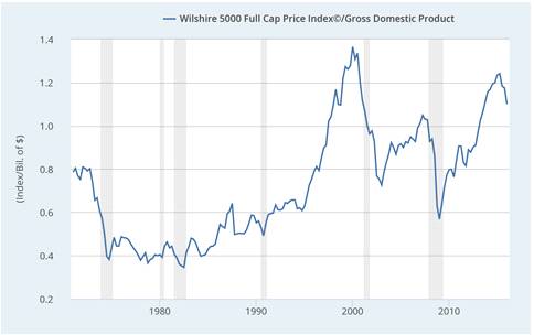 Переоцененность рынка предполагает, что в скором будущем, рынок вернется к историческому среднему значению, таким образом, существует вероятность будущего обесценения активов, что предполагает целесообразность держания больших запасов наличности. Особенно это актуально ввиду исторически высоких значений данного показателя, что говорит о том, что рынок часто бывает переоценен, и не редки благоприятные моменты для держателей кэша, когда предполагается, что в скором времени рынок будет находиться в состоянии спада. В частности, максимальное значение данного показателя было зафиксировано в 1999, как раз в период пузыря дот-комов.