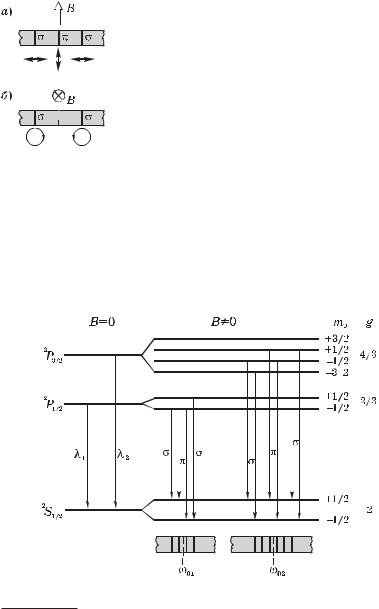 О поляризации зеемановских компонент. В заключение отметим, что - и #-компоненты оказываются поляризованными. При наблюдении перпендикулярно магнитному полю B, как показано на рис. 7.4, а, все три компоненты поляризованы линейно: у -компоненты колебания Е-вектора направлены вдоль В, а у #-компонент — перпендикулярно В.