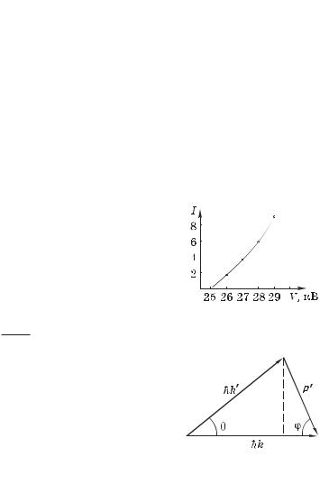 Р е ш е н и е. Изобразим график зависимости I(V), экстраполируя его к нулю, как показано на рис. 1.15, находим V0 25 кВ. При этом напряжении излучение с длиной волны 0 становится коротковолновой границей сплошного рентгеновского спектра. Значит, согласно (1.9)