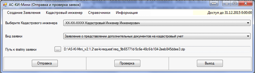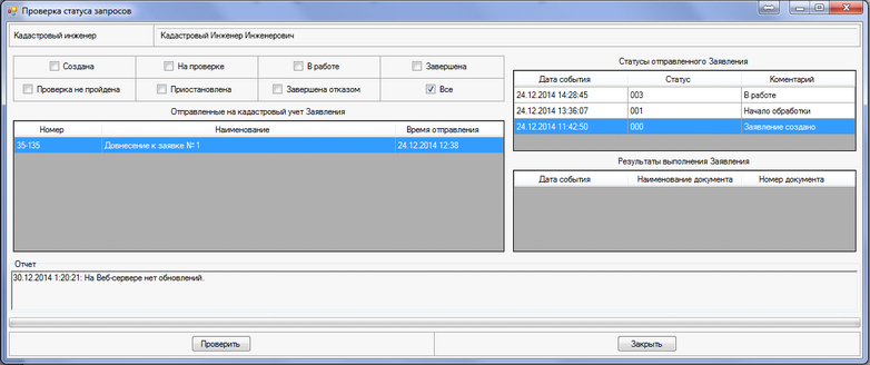 Статус выполнения Заявления можно проверить нажатием кнопка "Проверка" на Главном окне программы.