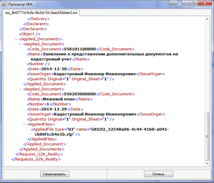 При выборе ZIP-пакета Межевого плана программа проверит его на соответствие схеме V04_STD_MP утвержденной Приказом Росреестра от 25.06.2013 № П/237. А так же каким Кадастровым инженером выполнен Межевой план и выполнен ли он в связи с образованием земельного участка (земельных участков). При успешной проверке ZIP-пакета в поле "Файл документа" появится путь к данному ZIP-пакету. Далее нажимаем кнопку "XML". Программа сформирует XML-файл Заявления в соответствии со актуальной схемой и отобразит его в окне "Просмотр XML".
