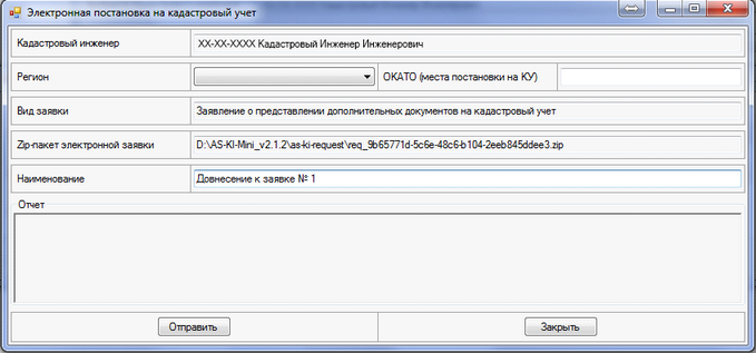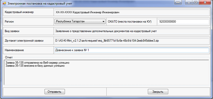После этого нажатием кнопки "Отправить" наше Заявление отправляется на КУ. Программа в поле "Отчет" выдаст номер Заявления отправленного на КУ.
