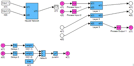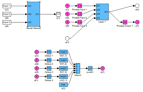 . Дополнил архитектуру созданной нейронной сети линиями задержки для входных сигналов и для сигналов между 2-м и 3-м слоями, превратив, таким образом, статическую сеть в динамическую:.inputWeights{1, 1}.delays = [0 1];.inputWeights{1, 2}.delays = [0 1];.layerWeights{3, 2}.delays = [0 1 2].