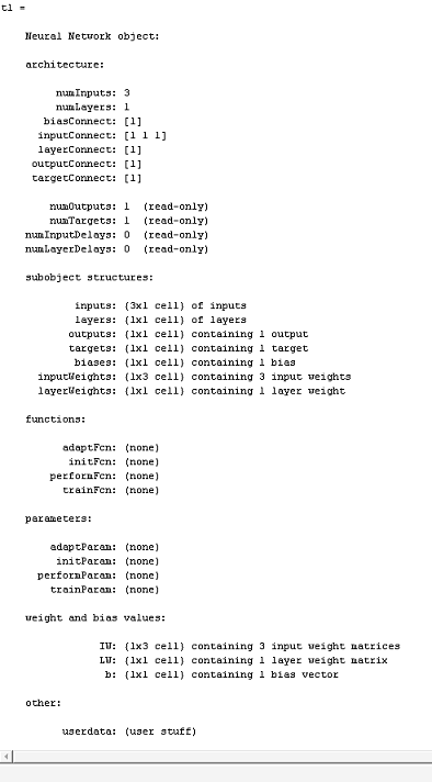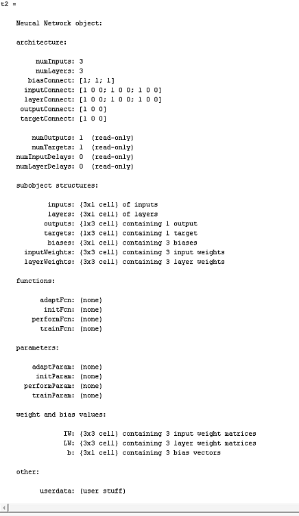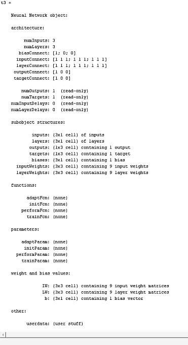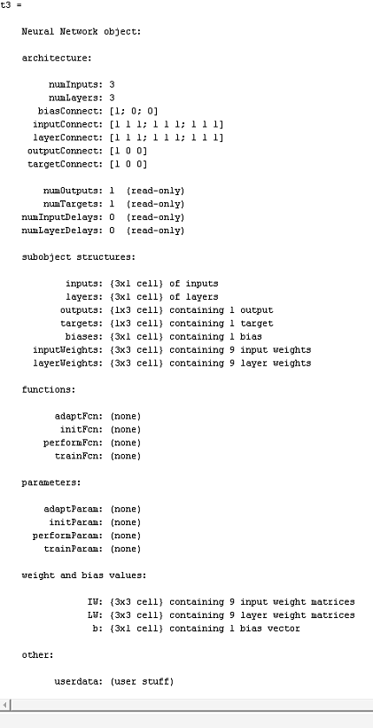 t3.inputWeights{1, 2}.delays = [0 1];.inputWeights{1, 3}.delays = [0 1];.inputWeights{2, 1}.delays = [0 1];.inputWeights{2, 2}.delays = [0 1];.inputWeights{2, 3}.delays = [0 1];.inputWeights{3, 1}.delays = [0 1 2];.inputWeights{3, 2}.delays = [2 1 2];.IW{1, 1} = [0.5 0.8];.IW{1, 2} = [0.5 0.2];.IW{1, 3} = [0.2 1];.IW{2, 1} = [0.2 1];.IW{2, 2} = [0.5 0.2];.IW{2, 3} = [0.5 1];.LW{3, 1} = [0.5 0.2 0.1];.LW{3, 2} = [0.1 0.2 0.1];.LW{3, 3} = [0 0.2 1];