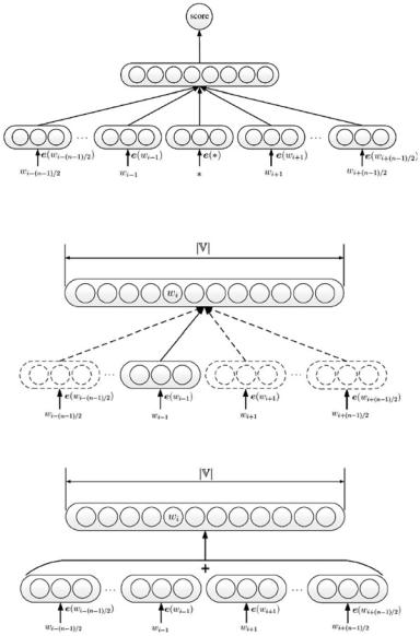 Fig. 3 C&W concatenates all the word vectors to predict whether it is a natural sentence or if it has replaced the center word with a random word [58]