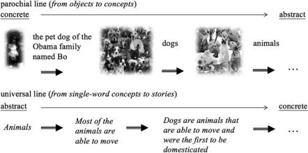 Fig. 1 Two main lines connecting abstract to concrete exist in the human culture. The Þrst one goes from concrete objects to more abstract collections of objects having common features. The second one goes from abstract single-word concepts to stories formed by the combination of many meaning-connected concepts