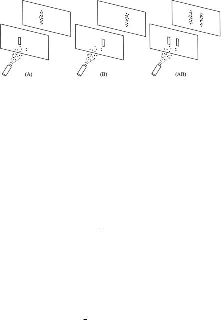 are closed. Then, there are no impacts on the detection screen, as no bullets can pass through the barrier. On the other hand, impacts on the detection screen will be observed if (A) the left slit is open and the right one is closed; (B) the right slit is open and the left one is closed; (AB) both slits are open. The distribution of impacts observed in these three conÞgurations is schematically depicted in Fig. 2. As one would expect, the Ôboth slits openÕ situation can be easily deduced from the two Ôonly one-slit openÕ situations, in the sense that if μA(x) and μB (x) are the probabilities of having an impact at location x on the detection screen, when only the left (resp., the right) slit is open, then the probability μAB (x) of having an impact at that same location x, when both slits are kept open, is simply given by the uniform average: