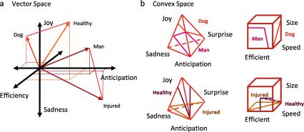 Conceptual Spaces. The idea of conceptual spaces, recently suggested in [32], is a more cognitively realistic way to define semantic spaces. This approach is called convex conceptual spaces. In short, concepts can be defined by a combination of others primitive features or quality dimensions, building spaces which can be superposed or not, to define regions of similarity. One perceptual example is to define taste based on some features such as: Saline, Sweet, Sour, and Bitter. Then, different kind of food would be described with a certain level of each taste dimension, and where other features like colour, texture, can also be incorporated [29]. Other complex example is defining elements regarding emotional states and factual features (Fig. 2b). Additionally, conceptual spaces require two semantic/meaning spaces, one for words in a quality dimension space (Fig. 2) and other for sentences in a “sentence meaning space” (Fig. 3a), then, the final sentence meaning is an “interaction” between both spaces.