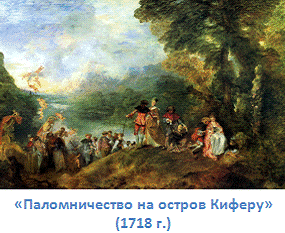 . Культ наслаждений как основной изображаемый жизненный принцип; персонажи "галантных сцен" и пейзажей принадлежат дворянской среде и заняты "необременительным времяпрепровождением".