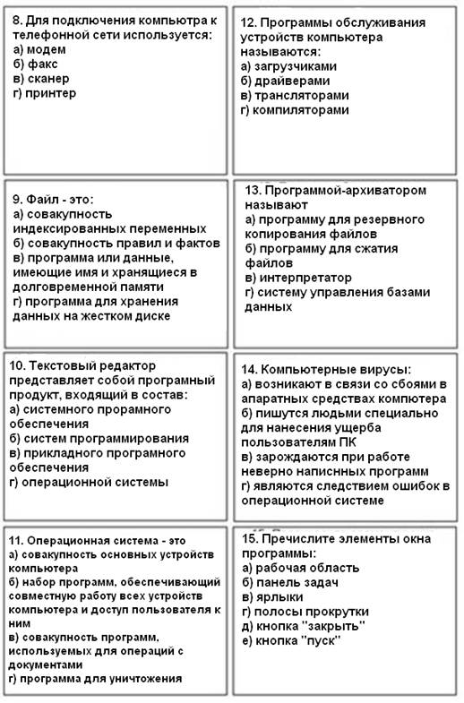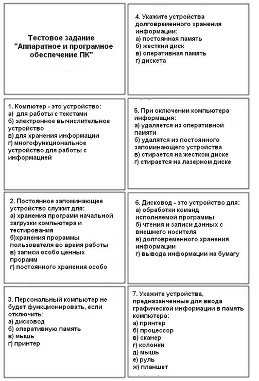 Во время проведения эксперимента для подтверждения или опровержения гипотезы данной работы было проведено тестирование, целью которого было выявления текущего уровня развития знаний, умений, навыков в области информатики и информационных компьютерных технологий, по выбранному разделу «Аппаратные и программные средства ИКТ ». Тестовые задания были разработаны с опорой на государственные стандарты. Тест состоял из 15 заданий и рассчитан на учащихся восьмых классов, задания составлены по выбранному разделу.