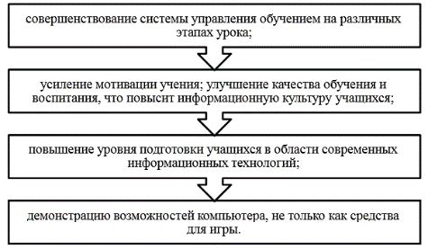 Эффективность учебного процесса несовместима с перегрузкой психической деятельности его участников. Применение компьютерной техники на уроках способно значительно повысить производительность труда участников педагогической деятельности за счет высококачественной передачи учебного материала, концентрации внимания на ключевых моментах, и в то же время уменьшить непродуктивные потери сил и времени на поиск, обработку, восприятие и усвоение информации. В настоящее время разработаны пакеты прикладных программ, ориентированных как на групповую работу во время занятий, так и на внеаудиторную работу ученика. Спецификой занятий в начальной школе является необходимость достаточно часто использовать наглядность как в виде стационарных ее форм, так и в динамике. С помощью ЭВМ со специальным проектором легко можно продемонстрировать необходимые образовательные материалы.