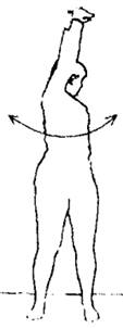 Упражнение "Скрутка": стойка как и в предыдущем упражнении. Проделывается при сильном натяжении мышц спины. Колени и тазовые кости остаются не подвижными. Верхняя часть тела поворачивается в талии плавно в одну и в другую сторону на максимально возможный угол. Желательно подержать тело в конечных положениях, какое - то время. При выполнении позвонки восстанавливают своё естественное положение в пространстве. Скрутку проделываем в обе стороны.