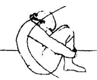 Упражнение "Колобок": Сидя на полу, подтягиваем, соединенные стопами ноги к паху, локтями упираемся в колени, спина выгнута дугой назад, голову подгибаем к груди. Опираемся на один локоть и прижимаем колено к полу. Опрокидываем корпус назад по боковой линии, перекатываясь на плечи, затем на второй бок и возвращаемся в исходное состояние. Обкатываем тело в одну и в другую сторону.