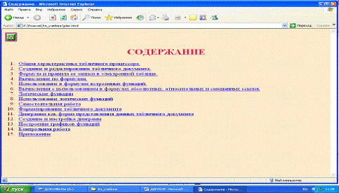 Электронный учебник по MS Excel создавался с помощью языка разметки гипертекста HTML. Данный учебник имеет практическую значимость и может быть использован учащимися начального профессионального образования при изучении темы "Электронные таблицы".