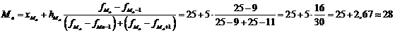 о накопленных частотах находится медианный интервал, а затем находим медиану по