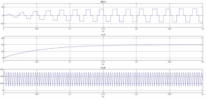 Рис.9 Графики мгновенных значений тока сети, тока и напряжения нагрузки для номинального угла опережения (β=47°).