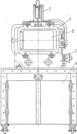 Смотровое окно 2 двери предназначено для наблюдения за работой испытываемых изделий. Наблюдение через смотровое окно позволяет при необходимости своевременно прекратить испытание и облегчает обнаружение мест пробоев или перекрытий по поверхности диэлектриков. Для подключения к испытываемому изделию источников питания и измерительной аппаратуры предусмотрены герметизированные выходы 3. Воздух отсасывается из камеры вакуумным насосом, который приводится в действие электродвигателем. Насос и электродвигатель расположены в ящике 4. Требуемое атмосферное давление устанавливают по показателям измерителя атмосферного давления - вакуумметра 5. По окончании испытаний производят впуск воздуха в камеру специальным краном.