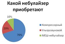 20% респондентов, покупающих небулайзеры, предпочитают ультразвуковые небулайзеры, 70% покупают компрессорные небулайзеры, 10% покупают МЕШ-небулайзеры.