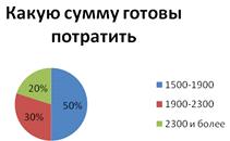 По данным опроса, 50% респондентов готовы потратить сумму от 1500 руб.-1900 руб., еще 30% от 1900 руб.-2300 руб. и 20% потратят сумму выше 2300 руб.