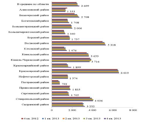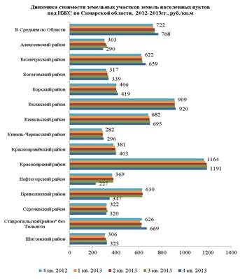 Наиболее высокие цены на земельные участки под ИЖС в 4 квартале 2013 года, так же как и на протяжении 2011/2013 гг. в целом, зафиксированы в наиболее привлекательных для инвесторов районах, а именно в Красноярском, Волжском и Кинельском районах (в среднем 700-1200 руб./кв.м).