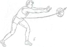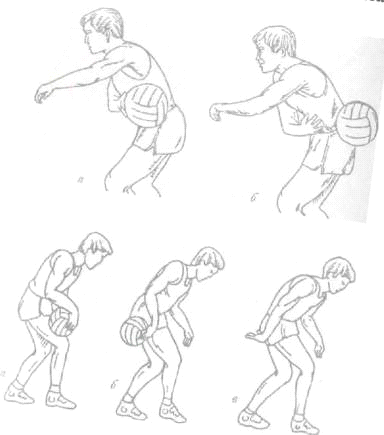 Передача мяча двумя руками снизу обычно применяется после поворота, (рис. 6). Мяч должен находиться сбоку, под правой рукой; кисти, держащие мяч, отведены назад, туловище укрывает мяч; плечо и предплечье правой руки образуют прямой угол; ноги согнуты в коленях, левая нога впереди. Разгибая руки в локтевых суставах, нужно сделать шаг и выпустить мяч. В последний момент делается толчок кистями и пальцами.