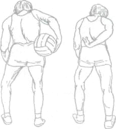 Передача мяча одной рукой назад из-под руки выполняется для передачи мяча партнеру на близкие расстоянии (рис 14,15) к партнеру, мяч держит двумя руками перед грудью, ноги согнуты. Правая рука движется влево, одновременно кисть левой руки снимается с мяча, локоть слегка приподнимается вверх, чтобы освободить путь правой руке с мячом. Правая рука выносит мяч к левому боку и захлестывающим движением кисти посылает его назад под левой рукой. Эта передача может выполняться на месте и с шагом
