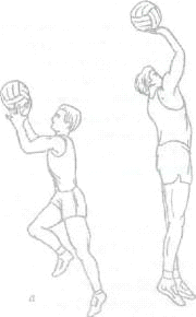 С близких и средних дистанций применяются броски мяча в прыжке с вытянутой вверх прямой рукой с захлестывающим движением кисти.