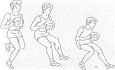 Но к изменению скорости бега нападающего защитник может быстро приспособиться. Поэтому, чтобы освободиться от опеки защитника, нападающий должен уметь резко изменять не только скорость, но и направление бега, сочетая его с обманными движениями, неожиданными остановками и ускорениями [15]. Остановка может выполняться прыжком и шагом в соответствии с рисунком 1,2. Остановка прыжком применяется баскетболистом, закончившим ведение, получившим мяч в движении, поймавшим мяч в высоком прыжке, а также с целью сближения с соперником и последующего прохода. Чтобы остановиться этим способом, баскетболист выполняет прыжок вверх - вперед - вправо, (влево). Приземляется он одновременно на обе широко расставленные и сильно согнутые ноги с легким проскальзыванием, одна нога выдвигается вперед. Туловище баскетболиста расслаблено, вес тела переносится на ногу, отставленную назад.