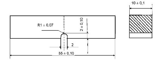 Используют образцы прямоугольной формы с концентратором типа U, V, Т (усталостная трещина). Наиболее распространенными образцами являются образцы размерами 55x10x10 мм с U-концентратом 2x2 мм (рисунок. 7).