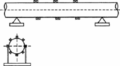 Для выделения балочных форм колебаний датчики располагают в вертикальном направлении сверху и снизу трубопровода в сечениях оболочки, расположенных по трассе трубопровода. Для определения оболочечных форм датчики располагают по окружности выбранного сечения оболочки (рисунок 13). Количество датчиков должно быть достаточным для определения формы колебаний.