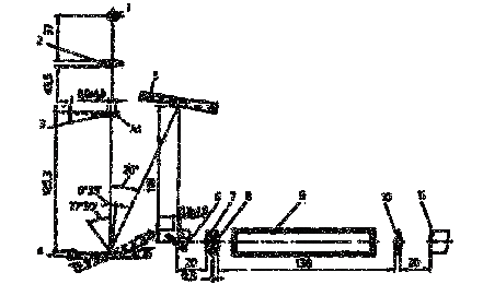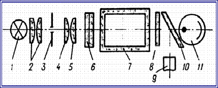 -нить лампы; 2-конденсор; 3-световой фильтр; 4,6 - дифракционная решетка; 5-вогнутое зеркало; 7,8- объектив; 9-кюветы; 10- линзы; 11- приёмник.