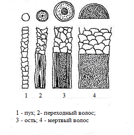 ) переходный волос: более толстый и жесткий, чем пух. Сердцевинный слой встречается местами;