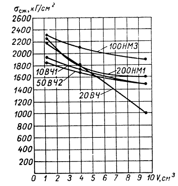 Из физических соображений, очевидно, что однородное поле напряжений, возникающее при сжатии цилиндрического образца, распространено практически по всему его объему. При этом прочность определяется числом микродефектов, находящихся в данном объеме, а также величиной «ослабления» материала, вносимого каждым отдельным дефектом. Если принять, что на единицу объема материала приходится примерно одинаковое количество дефектов одинаковой «силы», то становится очевидным, что с увеличением размеров образца повышается вероятность появления дефектов, существенно отличающихся от среднего уровня «силы». При этом становится более вероятным появление как весьма «слабых», так и весьма «сильных» дефектов.