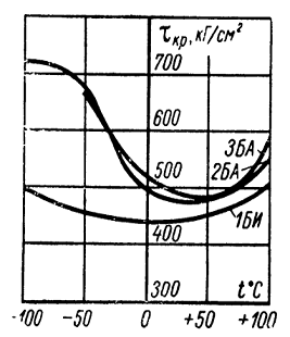 Рисунок 1.11 - Зависимость прочности магнитожестких ферритов при кручении от температуры.