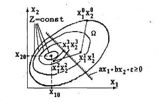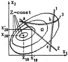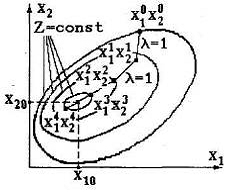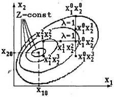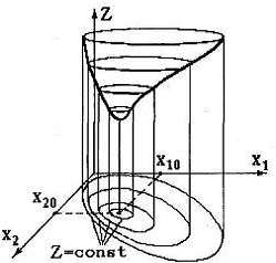 Таким образом, нелинейную функцию двух переменных Z(х1, х2) можно представить в двумерной плоскости х1, х2 линиями равного уровня Z=const. Эти концентрические линии стягиваются в точку с координатами х10 и х20, являющуюся минимумом целевой функции Z.