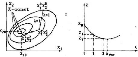 Итак, имеем три значения целевой функции Z0,Z1 и Z2, отвечающие нулевой (l=0), единичной (l=1) и двойной (l=2) длинам шага (рис. 2.5,6). Эти три значения характеризуют сечение целевой функции Z в выбранном направлении "спуска".